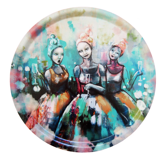 Svensktillverkad bricka i björkfaner. Motiv från originalmålningen "Champagnefesten