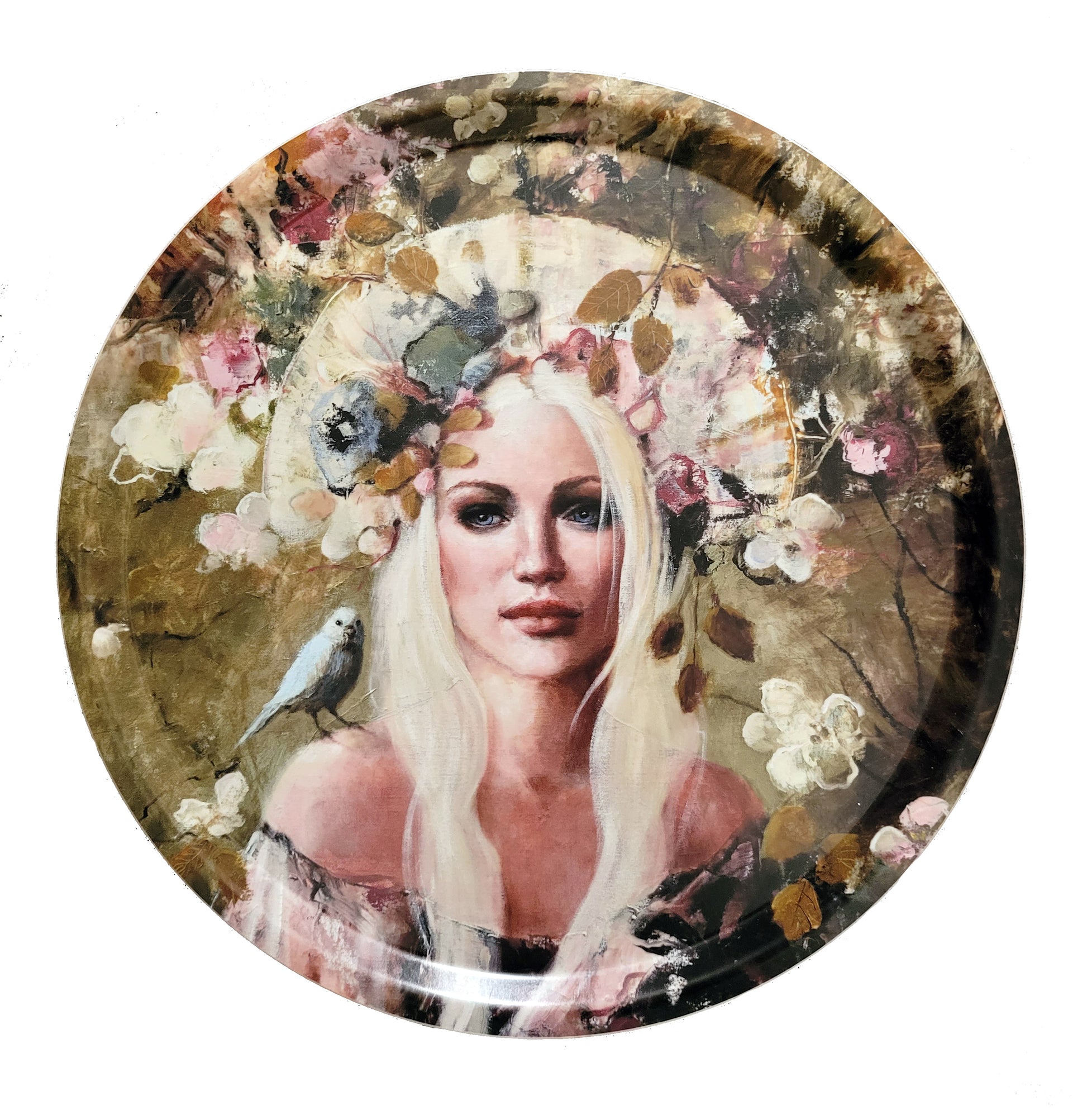 Svensktillverkad bricka i björkfaner. Motiv från originalmålningen "Essence of a moment"