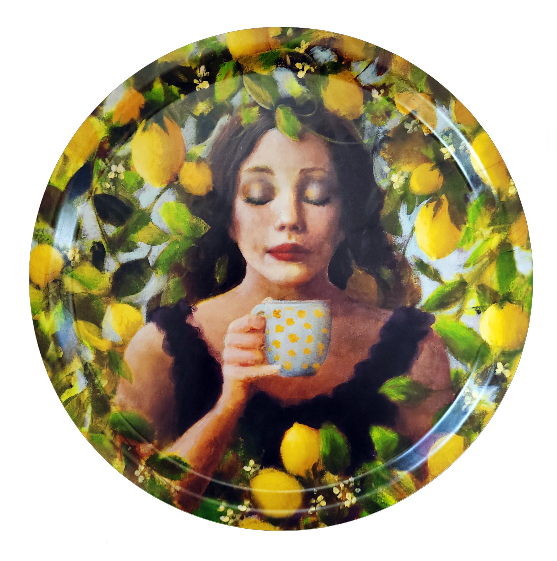 Svensktillverkad bricka i björkfaner. Motiv från originalmålningen "Under citronträdet"