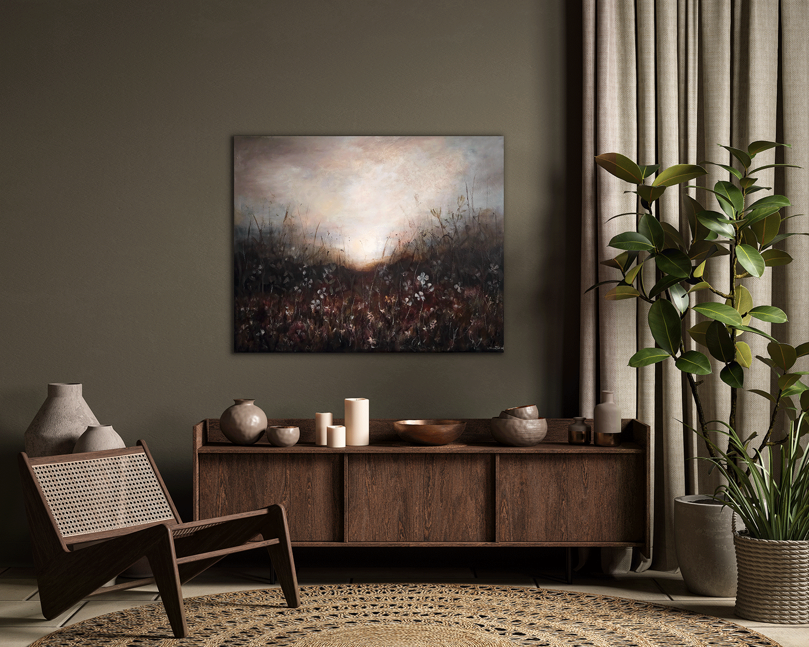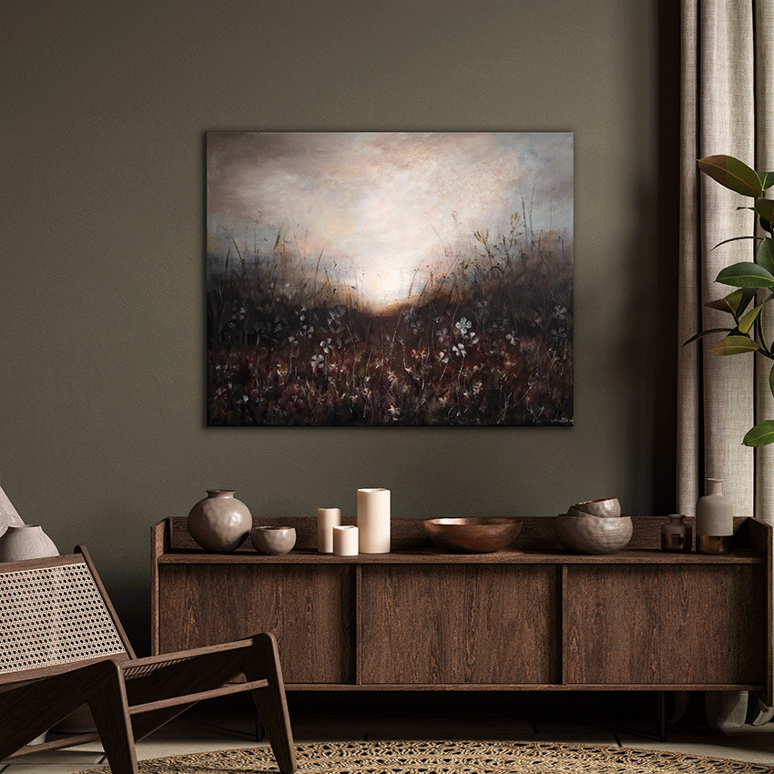 Målningen rör sig mellan det konkreta och det drömlika. De vilda gräsen och de skira blommorna växer fram ur ett dämpat landskap, där jordiga toner möter ett nästan himmelskt ljus.
